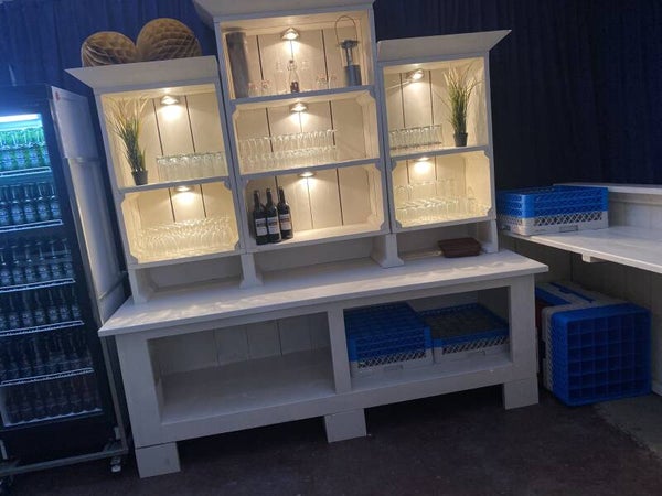Met deze witte achterwand/kast met baropstelling zorgt u er gegarandeerd voor dat uw gasten met plezier een drankje komen halen. Het steigerhouten design en de verlichting zorgen voor een eigentijdse look die perfect past bij een feestelijke gelegenheid.