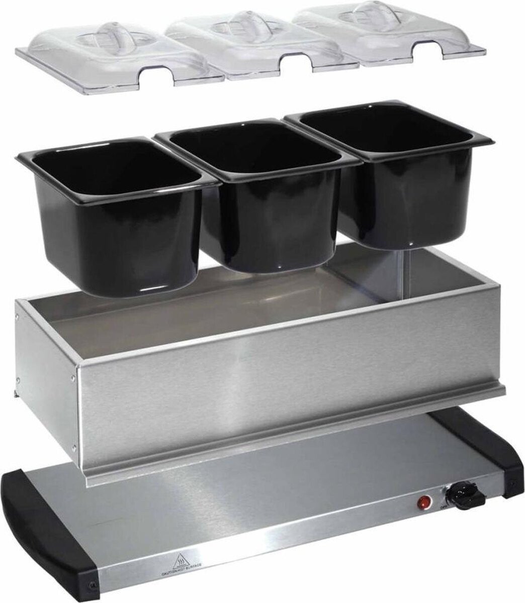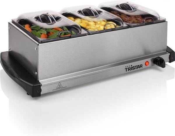 De buffetwarmer beschikt over drie bakken met een inhoud van 1.5 liter.
